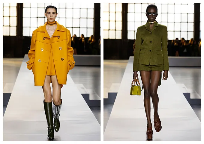 The warm tones of mustard and moss green were prominently featured, signalling a continuation of these autumnal shades into the Fall/Winter season. Jewellery in matching hues or complementary colours can elevate an outfit, offering a cohesive look. Amber, peridot, and malachite pieces, set in warm metals like gold and bronze, can mirror the richness of these colours, creating a harmonious blend with the season's palette.