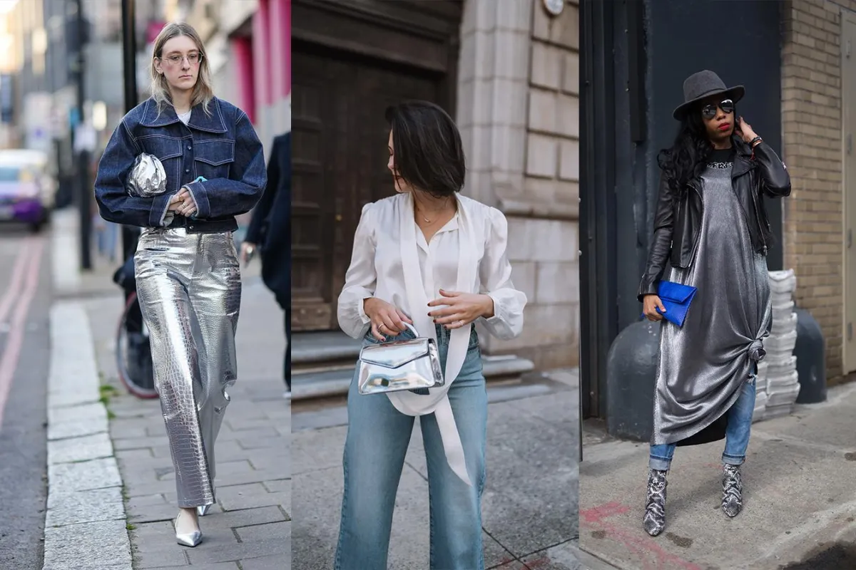 The trend spotlight shone brightly on silver, making it clear that metallics are not just for the night. I personally exemplified this trend with my own use of silver accents—metallic leather trousers and jackets gleamed in the daylight, while my Wales Bonner Adidas Sambas added a casual twist to the metallic motif.