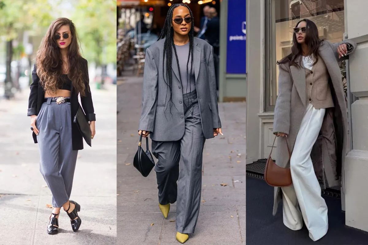 Grey tailoring emerged as a champion of contemporary chic, proving that grey is anything but dull. Paired with elegant sheer tights, this combo offers a refined yet practical solution to transitional weather dressing.